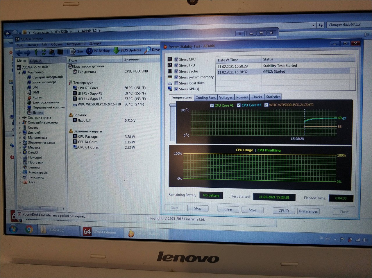 В результаті діагностики виявлено що в ноутбуці lenovo заглючила операційна система Windows,температура в нормі.
